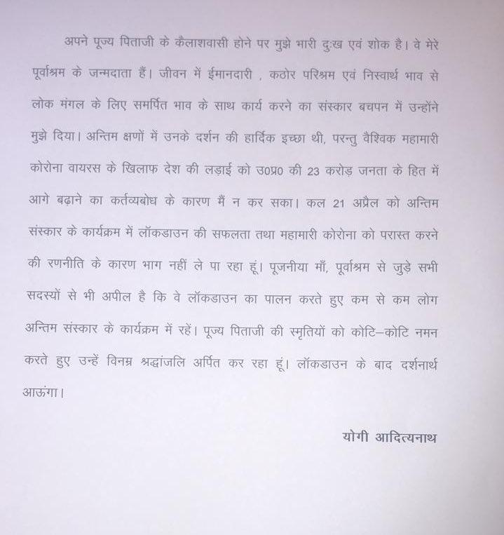मुख्यमंत्री योगी आदित्यनाथ ने कहा, “अंतिम क्षणों में पिता के दर्शन की इच्छा थी, परंतु वैश्विक महामारी कोरोनावायरस के खिलाफ देश की लड़ाई को उत्तर प्रदेश की 23 करोड़ जनता के हित में आगे बढ़ाने के कर्तव्यबोध के कारण मैं नहीं कर सका. कल 21 अप्रैल को अंतिम संस्कार के कार्यक्रम में लॉकडाउन की सफलता और महामारी कोरोना को परास्त करने की रणनीति के कारण भाग नहीं ले पा रहा हूं.”